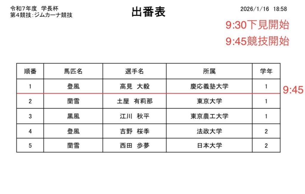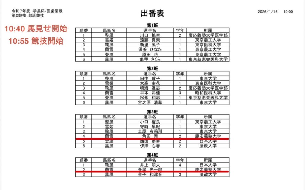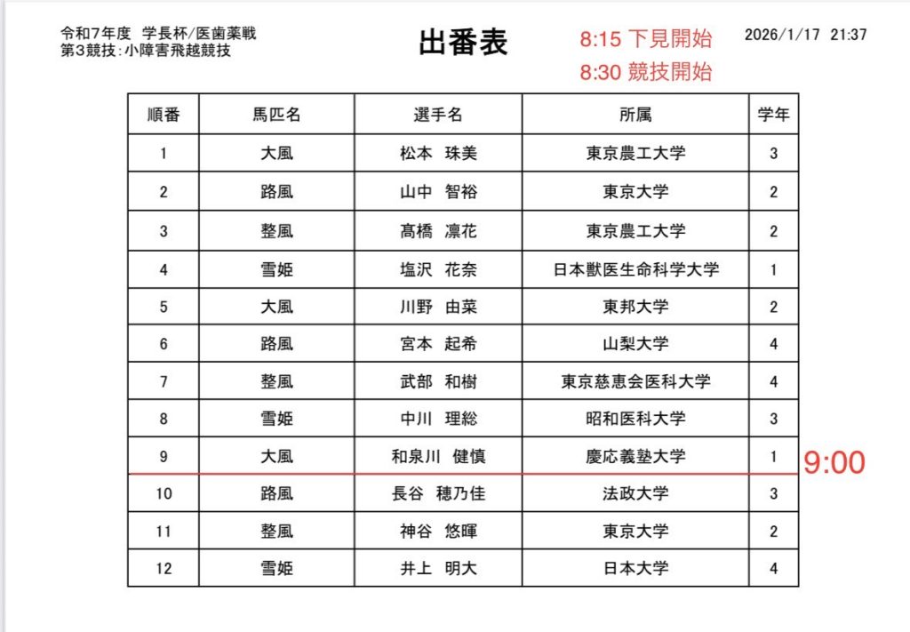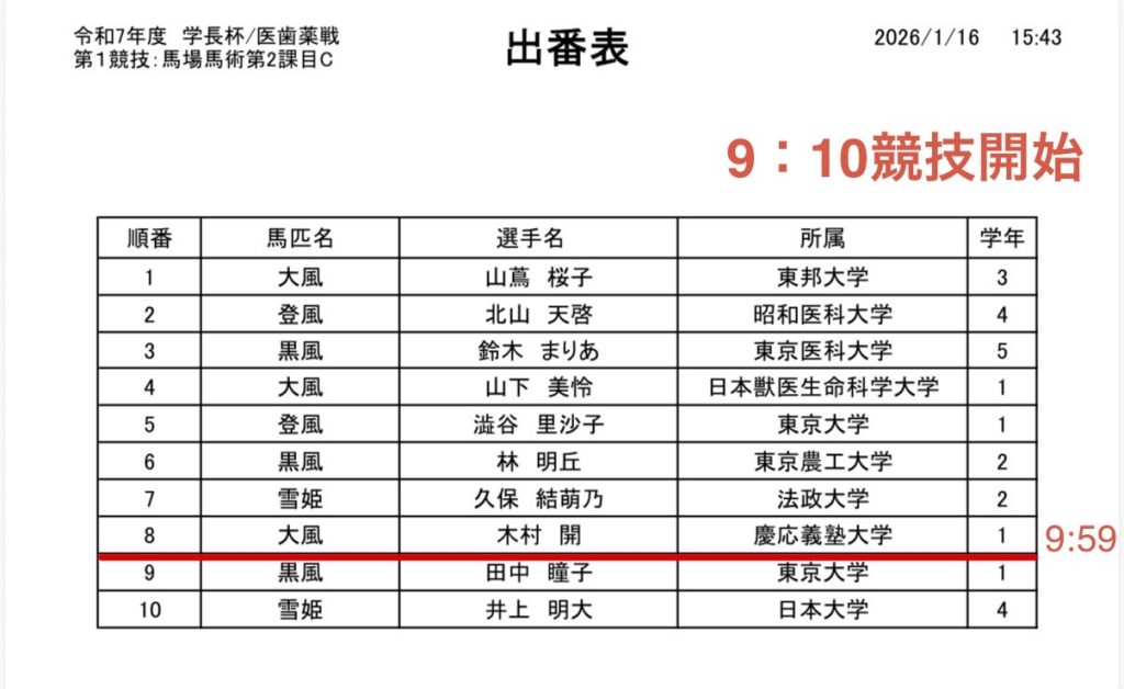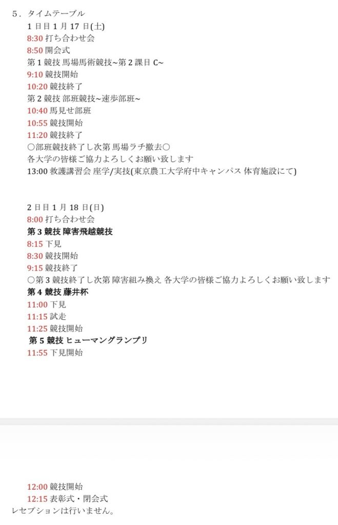 1月17日(土)から1月18日(日)、東京農工大学学友会馬術部馬場にて行われます【令和7年度東京農工大学学長杯馬術競技大会】の出番表を掲載致します。