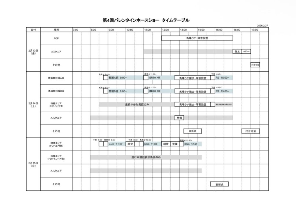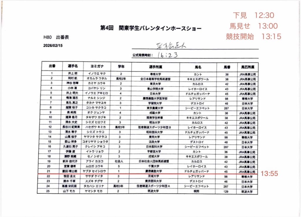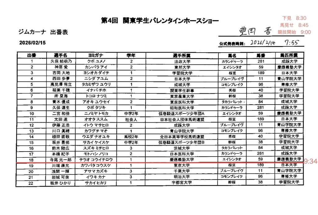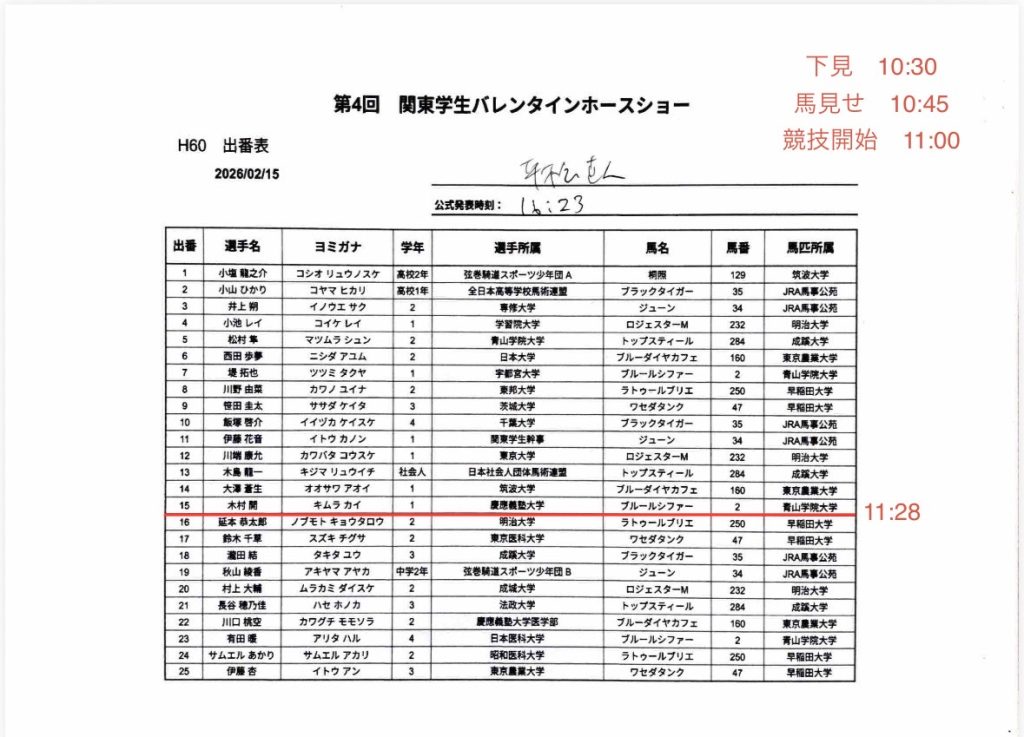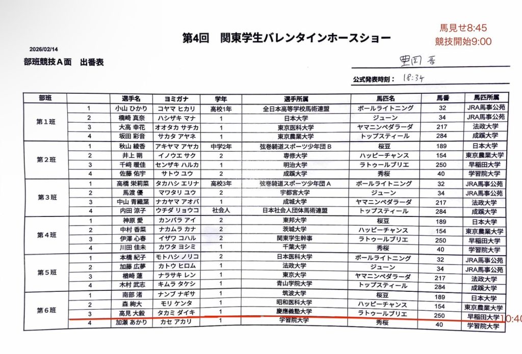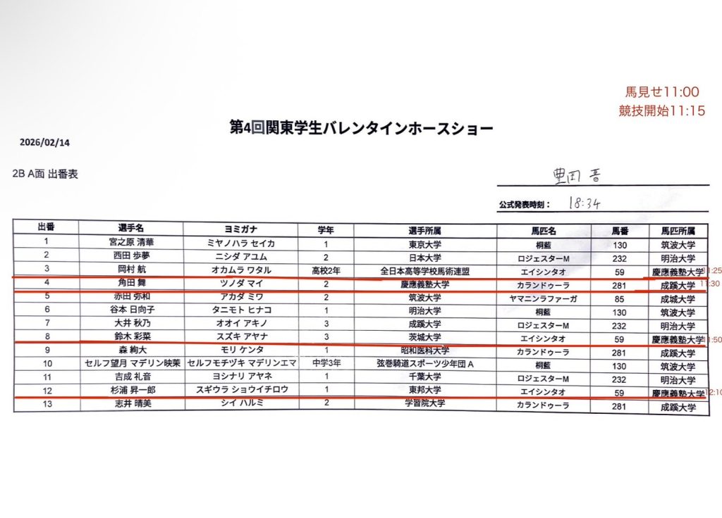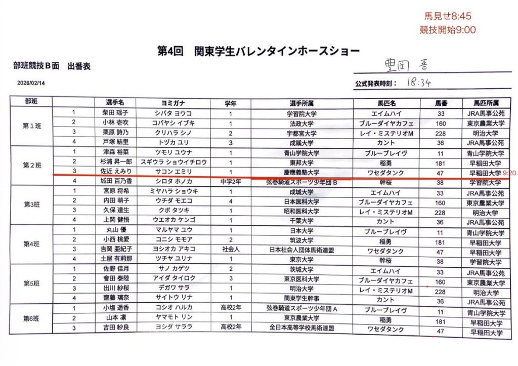 【第4回関東学生バレンタインホースショー】の出番表及びタイムテーブル 2026 2/13 試合情報 出場予定 2月14日(土)から2月15日(日)、JRA馬事公苑にて行われます【第4回関東学生バレンタインホースショー】の出番表及びタイムテーブルを掲載致します。2日間、ご声援の程宜しくお願い申し上げます。〈第2日目〉〈第1日目〉 試合情報 出場予定 この記事が気に入ったら フォローしてね! Follow @keio_equestrian Follow Me ぜひシェアしてください! URLをコピーする URLをコピーしました! 関連記事 【第4回関東学生バレンタインホースショー】の結果表 2026年2月15日 【令和7年度関西大学・関西学院大学馬術定期戦】の結果表 2026年2月8日 【令和7年度関大・関学戦】の出番表・タイムテーブル 2026年2月6日 【令和7年度東京農工大学学長杯馬術競技大会】の出番表 2026年1月16日 【第10回全日本高校生自馬選手権大会】の結果表 2025年12月14日 【第97回全日本学生馬術選手権大会/第61回全日本学生馬術女子選手権大会】の結果表 2025年12月13日 【第97回全日本学生馬術選手権大会/第61回全日本学生馬術女子選手権大会】の出番表 2025年12月13日 【第10回全日本高校生自馬選手権大会】の出番表 2025年12月13日
