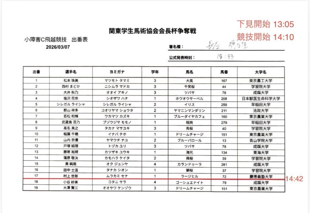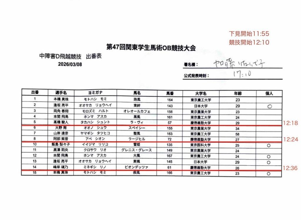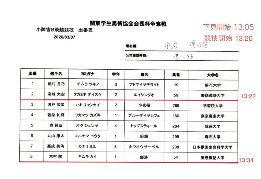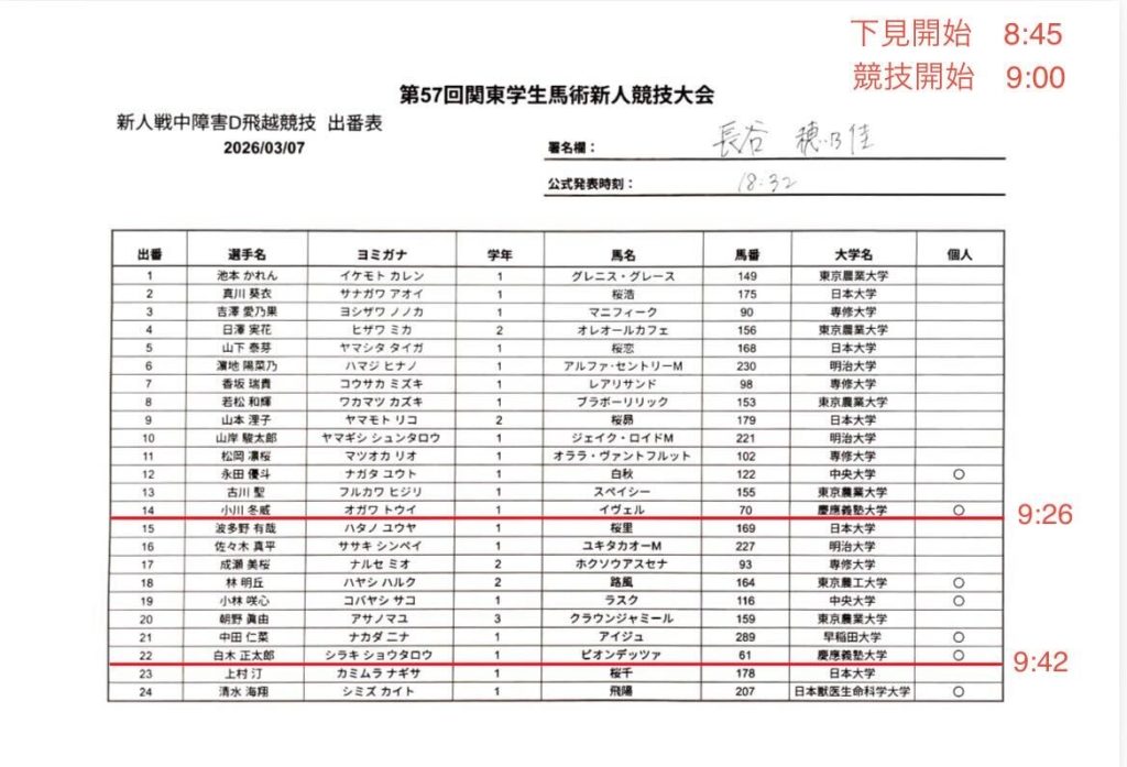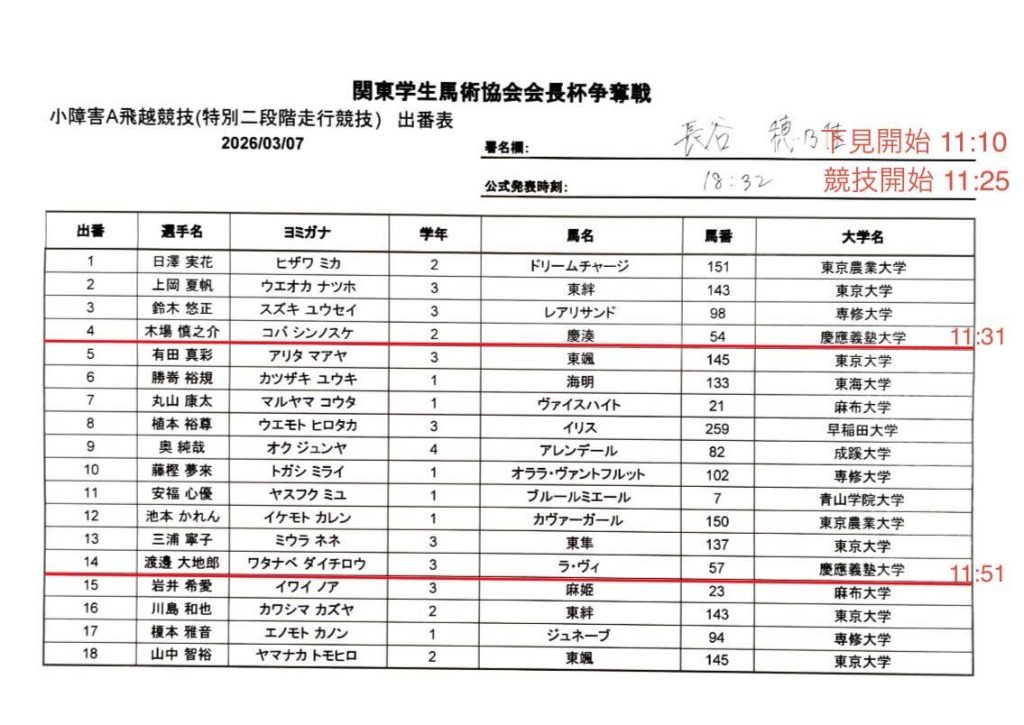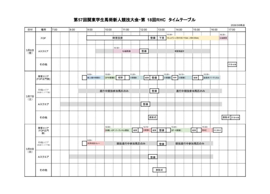 月6日(金)から3月8日(日)、JRA馬事公苑にて行われます【第57回関東学生馬術新人競技大会】、【第47回関東学生馬術OB競技大会】及び【関東学生馬術協会会長杯争奪戦】の出番表とタイムテーブルを掲載致します。