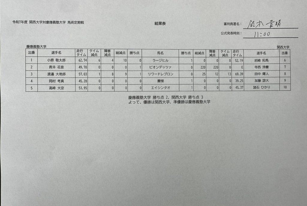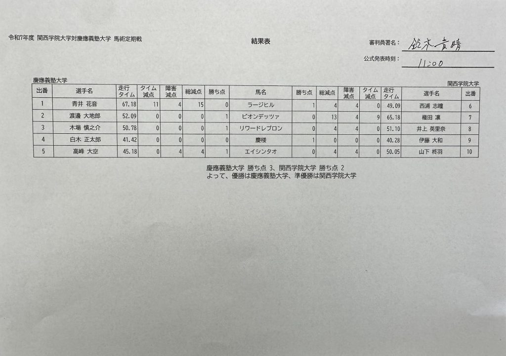 本日2月8日、日吉馬場にて行われました【令和7年度関西大学・関西学院大学馬術定期戦】の結果をお知らせいたします。