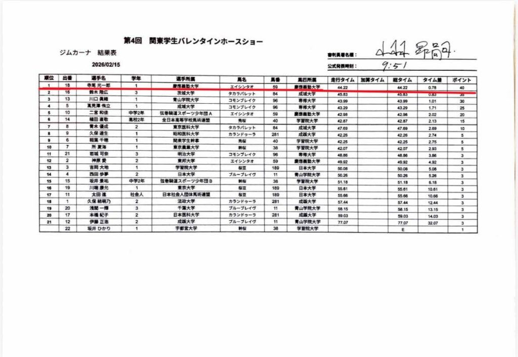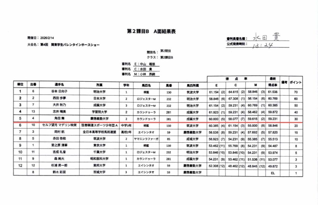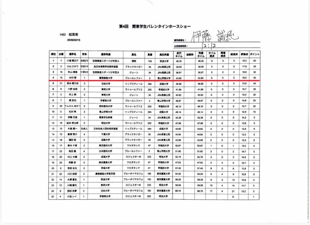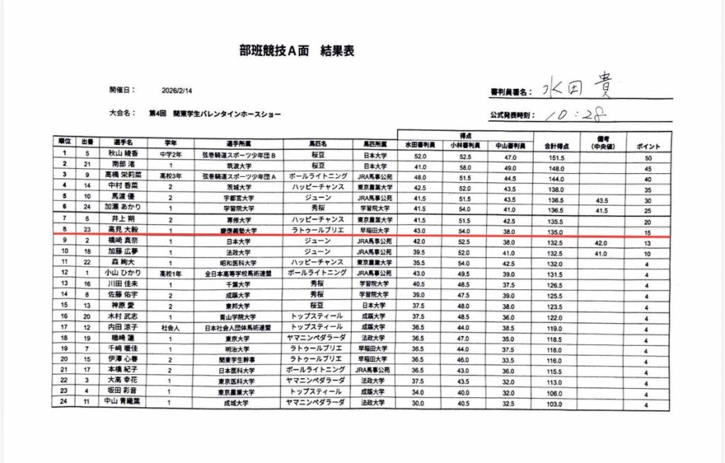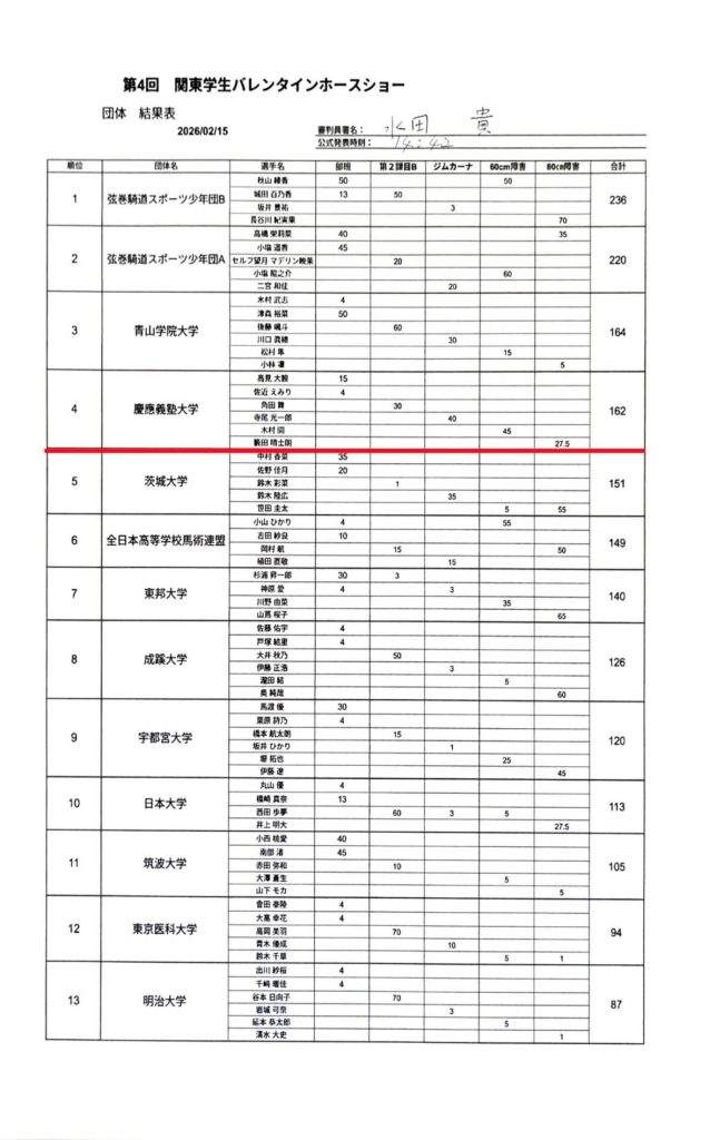 【第4回関東学生バレンタインホースショー】の結果表 2026 2/15 試合情報 試合結果 2月14日、2月15日に馬事公苑にて行われました【第4回バレンタインホースショー】の結果をお知らせいたします。《団体成績》《個人成績》 試合情報 試合結果 この記事が気に入ったら フォローしてね! Follow @keio_equestrian Follow Me ぜひシェアしてください! URLをコピーする URLをコピーしました! 関連記事 【第4回関東学生バレンタインホースショー】の出番表及びタイムテーブル 2026年2月13日 【令和7年度関西大学・関西学院大学馬術定期戦】の結果表 2026年2月8日 【令和7年度関大・関学戦】の出番表・タイムテーブル 2026年2月6日 【令和7年度東京農工大学学長杯馬術競技大会】の結果表 2026年1月18日 【令和7年度東京農工大学学長杯馬術競技大会】の出番表 2026年1月16日 【第10回全日本高校生自馬選手権大会】の結果表 2025年12月14日 【第97回全日本学生馬術選手権大会/第61回全日本学生馬術女子選手権大会】の結果表 2025年12月13日 【第97回全日本学生馬術選手権大会/第61回全日本学生馬術女子選手権大会】の出番表 2025年12月13日