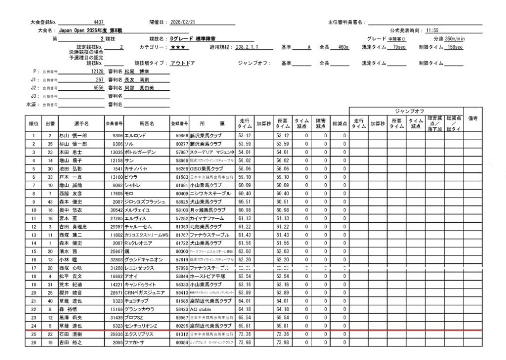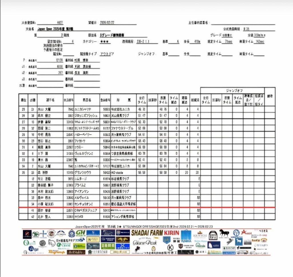 【Japan Open 2025年度 第8戦】の結果表 2026 2/23 試合情報 試合結果 2月21日から2月23日まで、つま恋乗馬クラブで行われました【Japan Open 2025年度 第8戦】の結果をお知らせいたします。 試合情報 試合結果 この記事が気に入ったら フォローしてね! Follow @keio_equestrian Follow Me ぜひシェアしてください! URLをコピーする URLをコピーしました! 関連記事 【JapanOpen2025年度 第8戦】の出番表・タイムテーブル 2026年2月20日 【第4回関東学生バレンタインホースショー】の結果表 2026年2月15日 【第4回関東学生バレンタインホースショー】の出番表及びタイムテーブル 2026年2月13日 【令和7年度関西大学・関西学院大学馬術定期戦】の結果表 2026年2月8日 【令和7年度関大・関学戦】の出番表・タイムテーブル 2026年2月6日 【令和7年度東京農工大学学長杯馬術競技大会】の結果表 2026年1月18日 【令和7年度東京農工大学学長杯馬術競技大会】の出番表 2026年1月16日 【第10回全日本高校生自馬選手権大会】の結果表 2025年12月14日