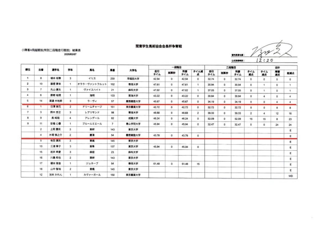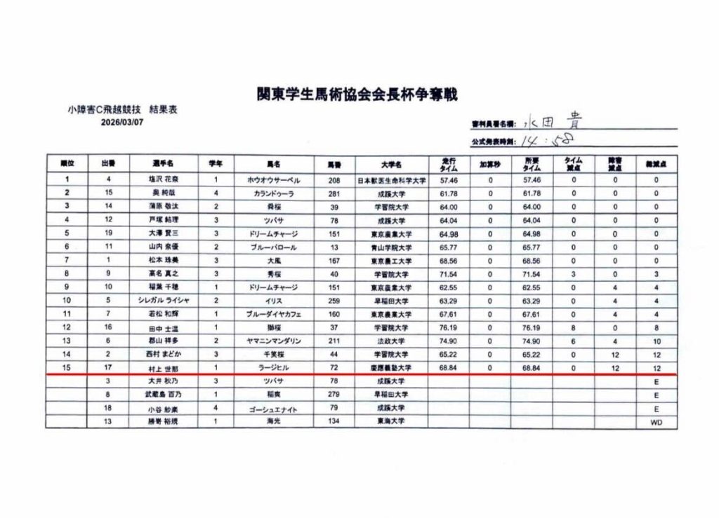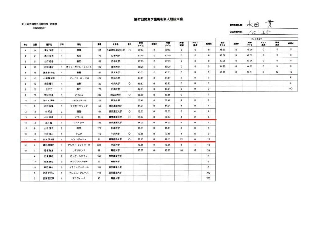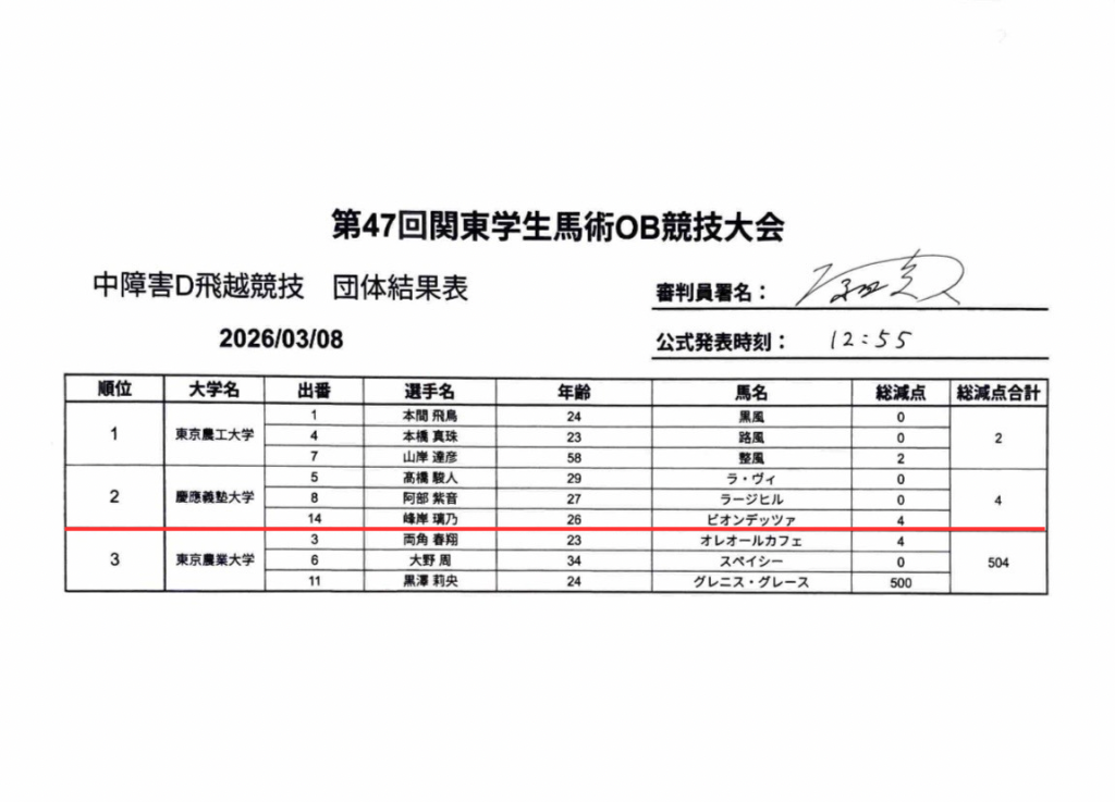 3月6日から3月8日まで、JRA馬事公苑で行われました【第57回関東学生馬術新人競技大会】、【第47回関東学生馬術OB競技大会】及び【関東学生馬術協会会長杯争奪戦】の結果をお知らせいたします。
