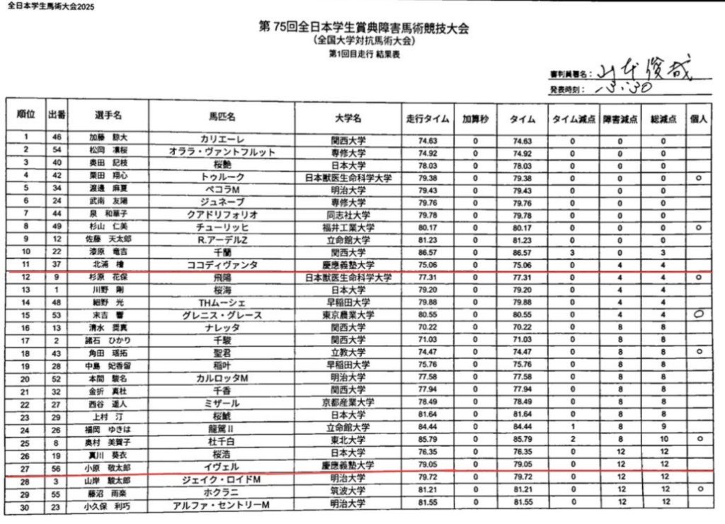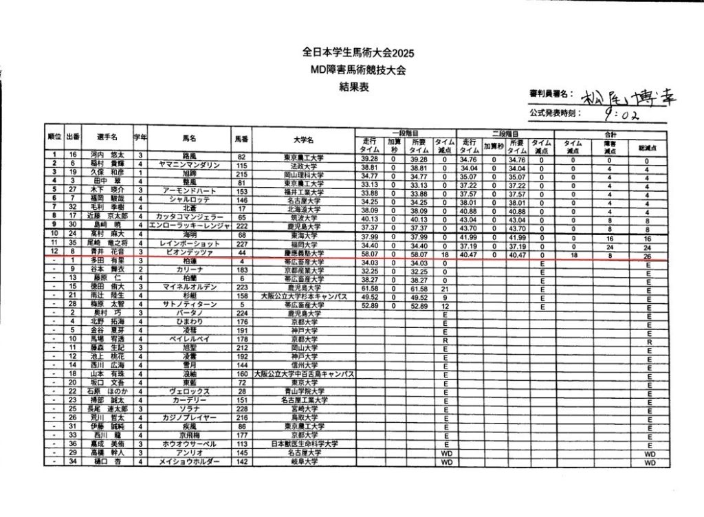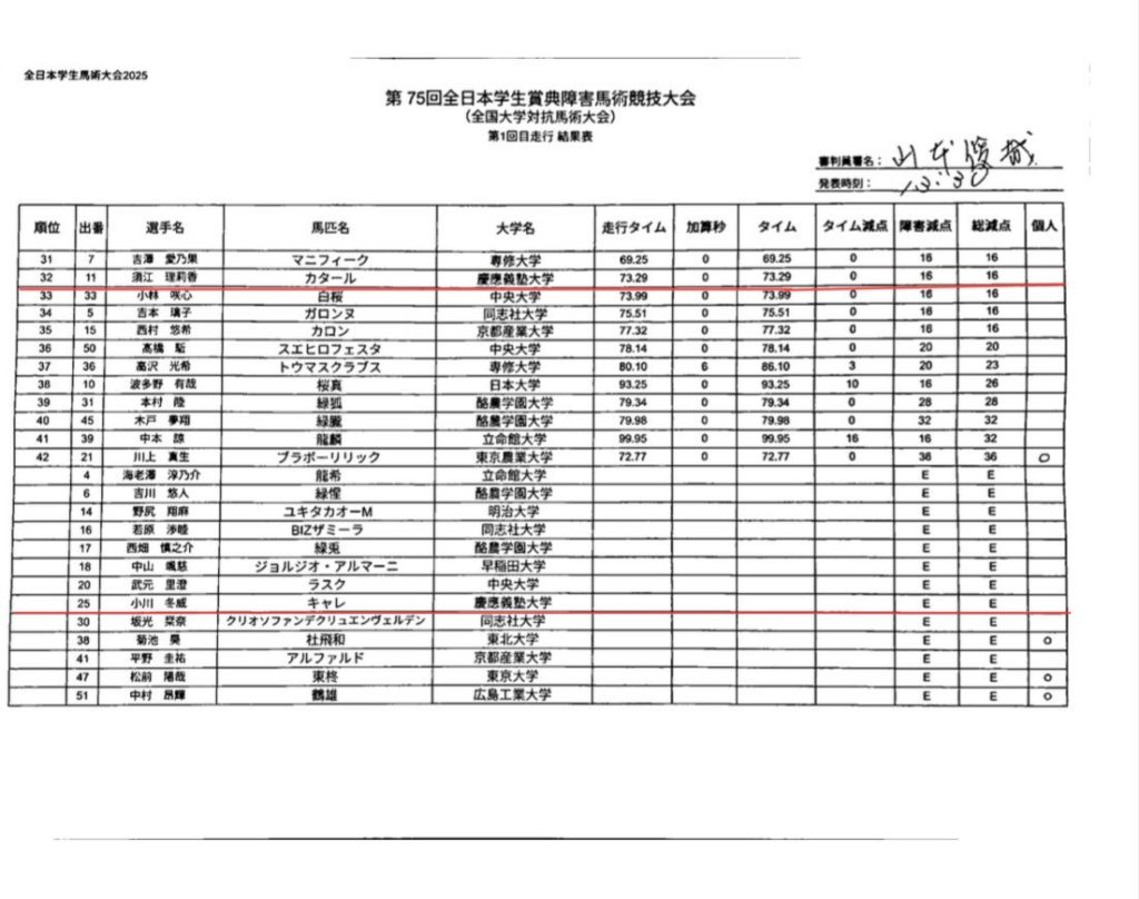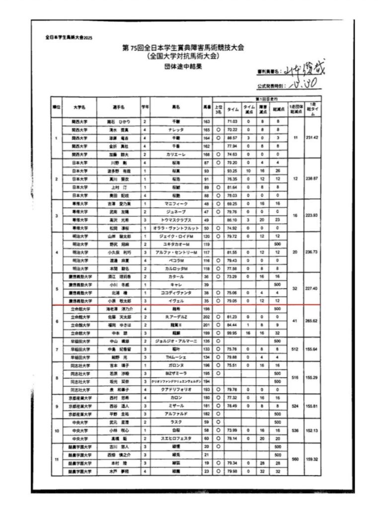 【全日本学生馬術大会2025】〈第1日目〉の結果表 2025 10/31 試合結果 本日10月30日(木)、三木ホースランドパークにて行われました、【全日本学生馬術大会2025】第1・2日目の結果をお知らせ致します。〈第2日目〉〈第1日目〉 試合結果 この記事が気に入ったら フォローしてね! Follow @keio_equestrian Follow Me ぜひシェアしてください! URLをコピーする URLをコピーしました! 関連記事 【第61回関東高等学校自馬競技大会】の結果表 2025年10月5日 【令和7年度関東学生馬術競技大会 (三大大会)】の全結果のお知らせ 2025年6月22日 【第46回 全日本ヤング総合馬術大会2025】の結果 2025年5月25日 【第52回東京都馬術大会】の結果 2025年5月18日 【2025 Tokyo イベンティングフェスティバル May】の結果 2025年5月11日 山梨県馬術競技場【CCI2*-S Yamanashi 2025】の結果 2025年4月27日 【第75回全早稲田対全慶應義塾馬術定期戦】の全結果 2024年12月1日 【第9回関東学生馬術男子競技大会】、【第62回関東学生馬術女子競技大会】及び【令和6年度関東学生馬術協会会長杯争奪戦】の結果 2024年11月17日